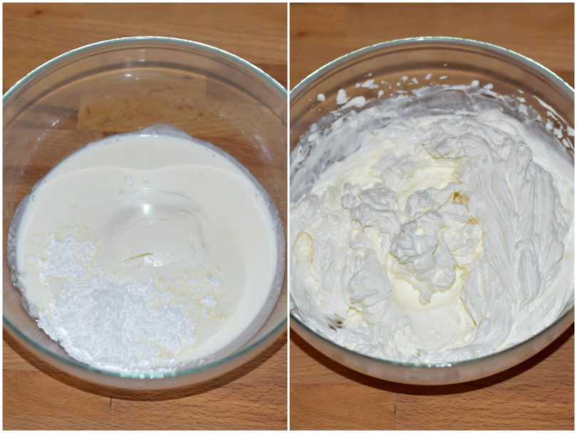 Mentre le crêpes si raffreddano, occupatevi della farcia: versate in una ciotola panna ben fredda di frigo, mascarpone e zucchero a velo e montate con le fruste fino ad ottenere un frosting spumoso.