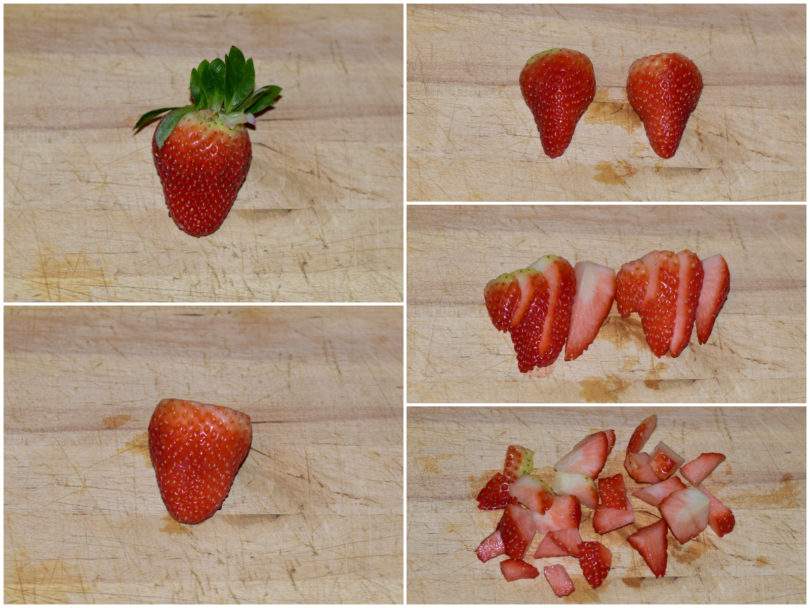 Mondate le fragole e tagliatele a cubetti (lasciate qualche fettina per la decorazione).