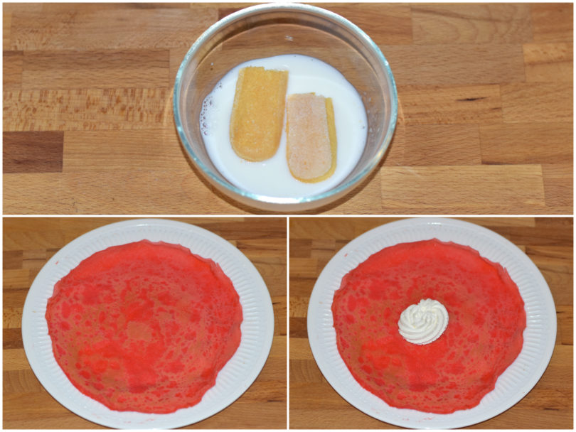 Tagliate un savoiardo a metà, bagnatelo brevemente nel latte, poi mettetelo sul frosting.