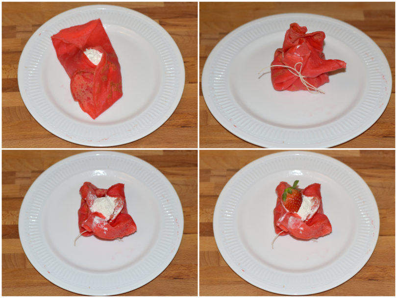 I fagottini di crêpes rossi sono pronti, non vi resta che decorare con granella di pistacchi se la gradite, e servirli.
