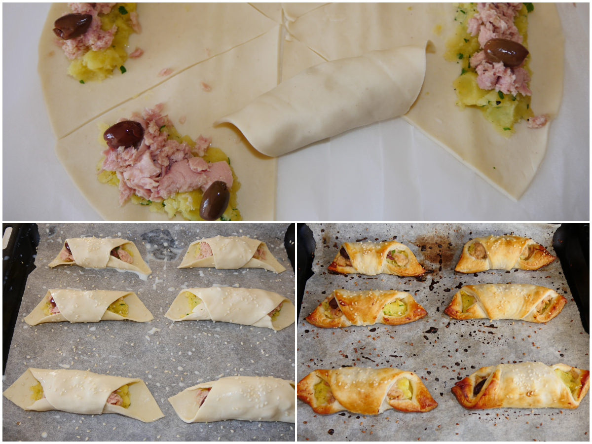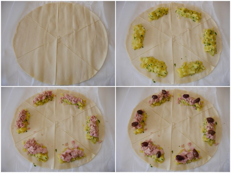 Tagliate la pasta sfoglia in 6 spicchi uguali, disponete un po' di composto di patate sulla parte larga, quindi aggiungete tonno e olive.