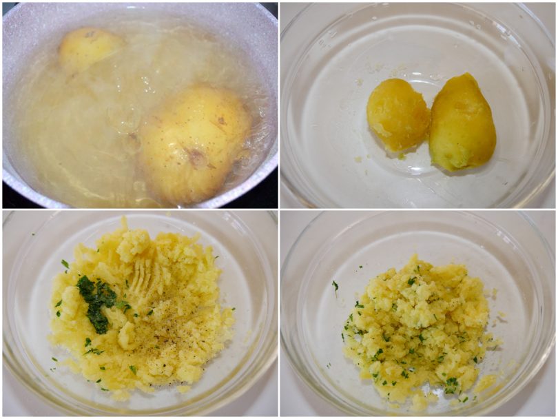 Innanzitutto lavate le patate, fatele cuocere per circa 35-40 minuti (dipende dalle dimensioni delle patate), quindi pelatele, schiacciatele con una forchetta e conditele con sale, pepe e prezzemolo tritato.
