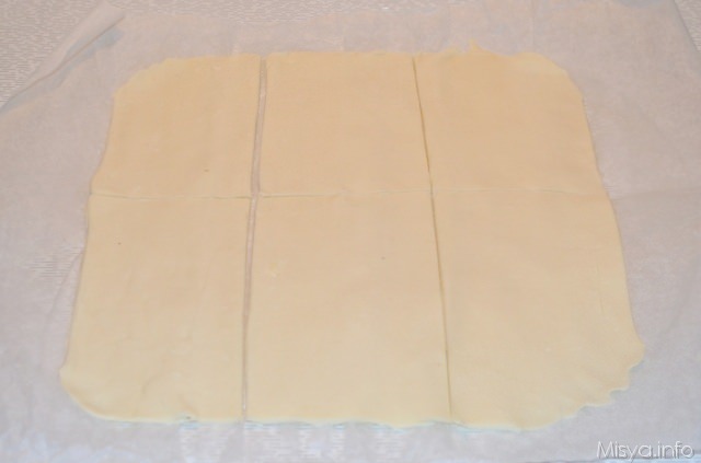 Stendere la pasta sfoglia su un piano infarinato e tagliarla a rettangoli della stessa dimensione