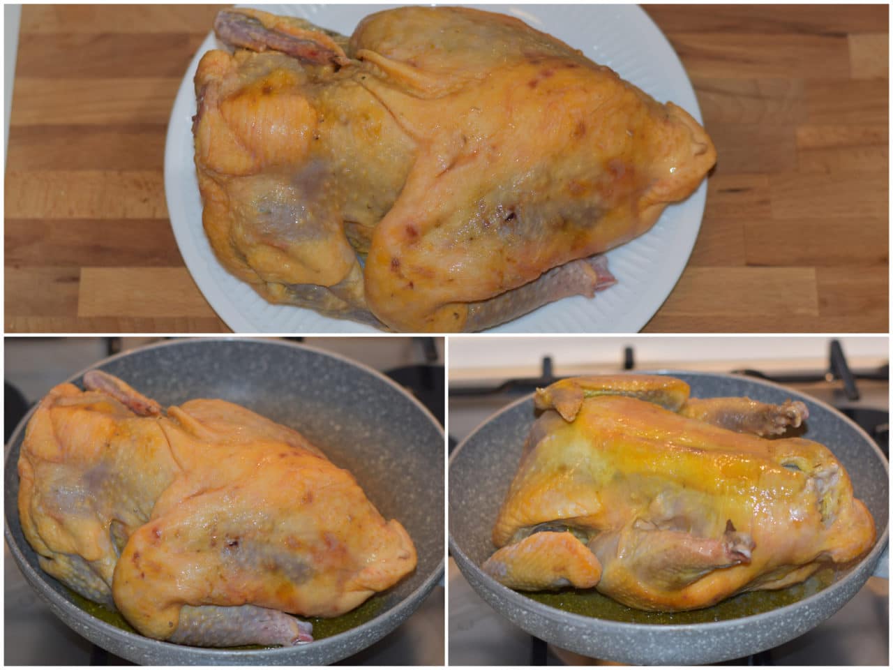 Condite l'interno della faraona con sale e pepe, quindi fatela rosolare in un tegame antiaderente con poco olio, lasciandola dorare in maniera uniforme a fiamma vivace, in modo da sigillarne i succhi.