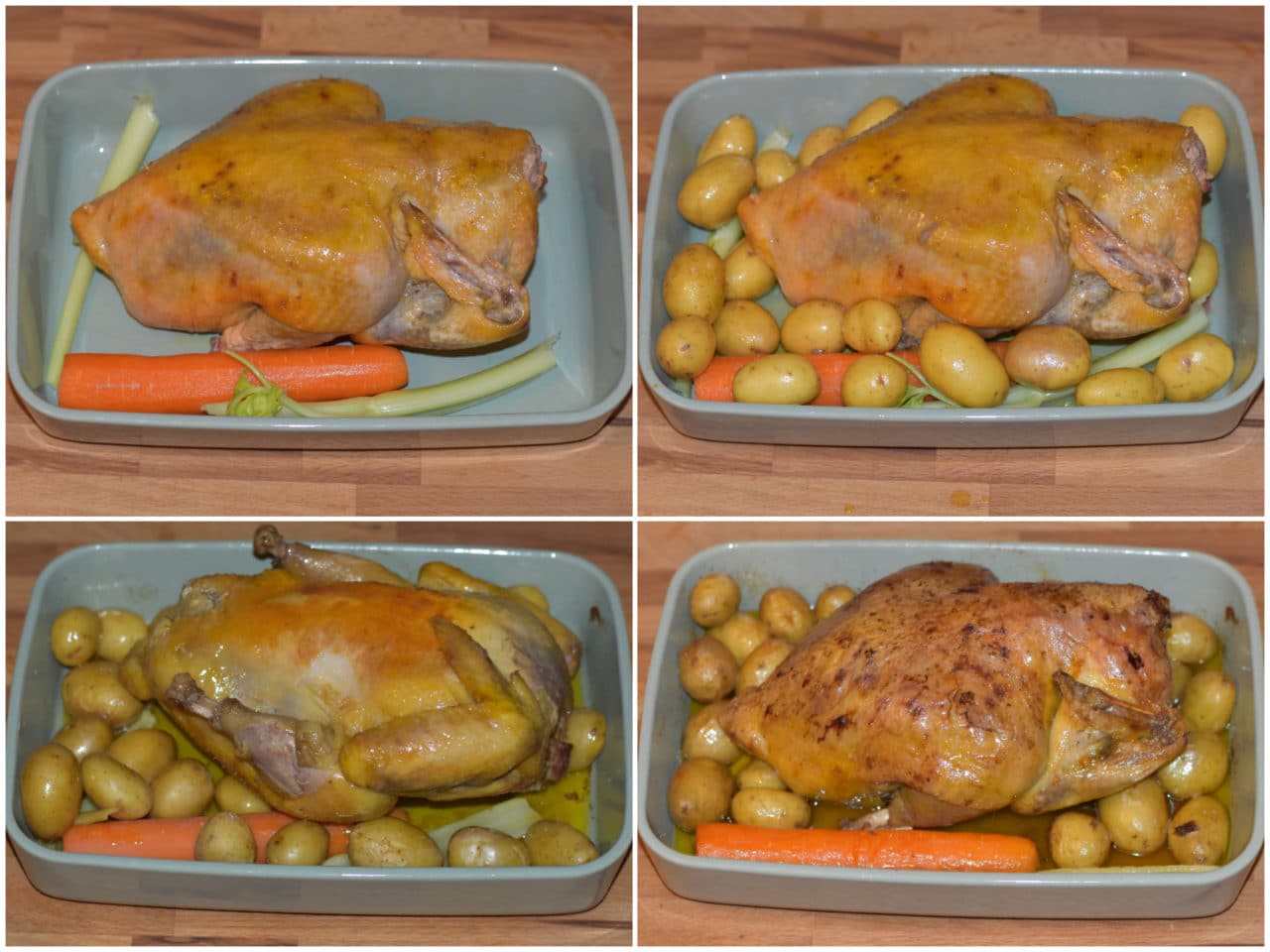 La faraona arrosto è pronta, non vi resta che spennellarla con il fondo di cottura e servirla.