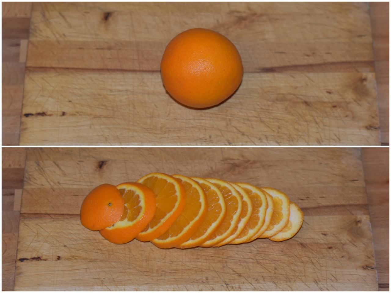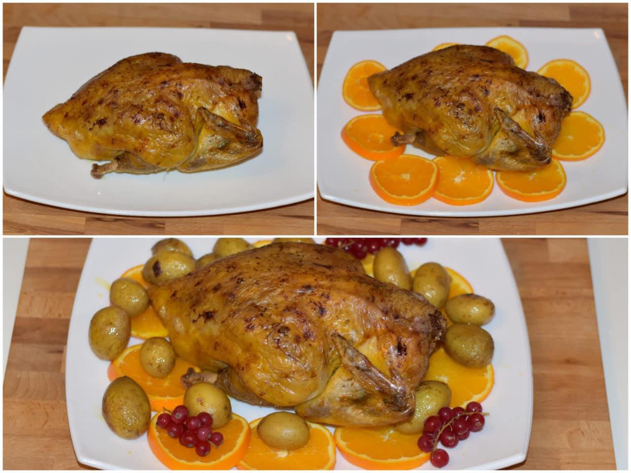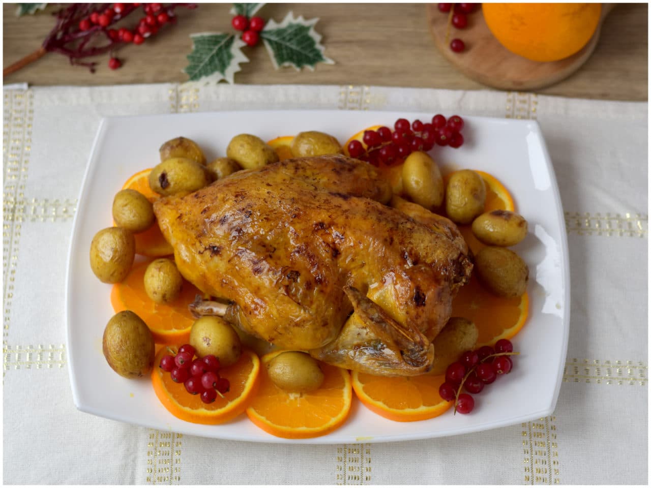 Una volta cotta la carne, tagliate la seconda arancia a fettine dopo averla lavata bene, quindi impiattate la gallina su di un piatto da portata disponendole intorno arancia, patate e ribes.