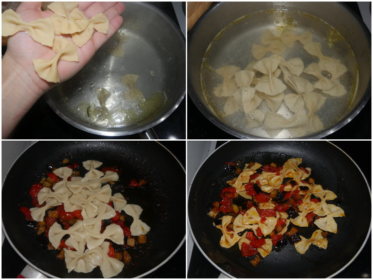 A questo punto non vi resta che cuocere le vostre farfalle in acqua bollente leggermente salata (quando cuocio la pasta fresca io ci aggiungo 1 cucchiaio di olio, per essere sicura che i maccheroni non si attacchino tra loro), scolarle dopo 5 minuti e condirle a piacere: qui io ho usato un sughetto fresco fatto con aglio, olio pomodorini e melanzane.