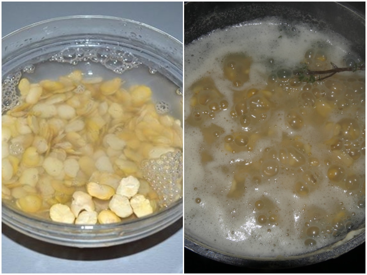 Innanzitutto lasciate a bagno le fave per almeno 10-12 ore, quindi scolatele, sciacquatele, mettetele in una casseruola, aggiungete del timo, coprite con acqua abbondante e cuocete con coperchio, a fiamma bassa, per circa 2 ore.