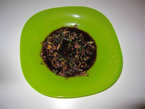 Mescolate lo scalogno tritato e le erbe aromatiche insieme alla salsa cdi soia. Salate e pepate.