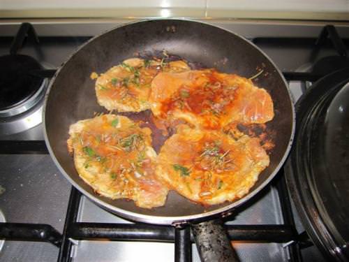 Fate cuocere in padella le fettine alle erbe e salsa di soia insieme alla marinata, cuocendo per un paio di minuti per lato.