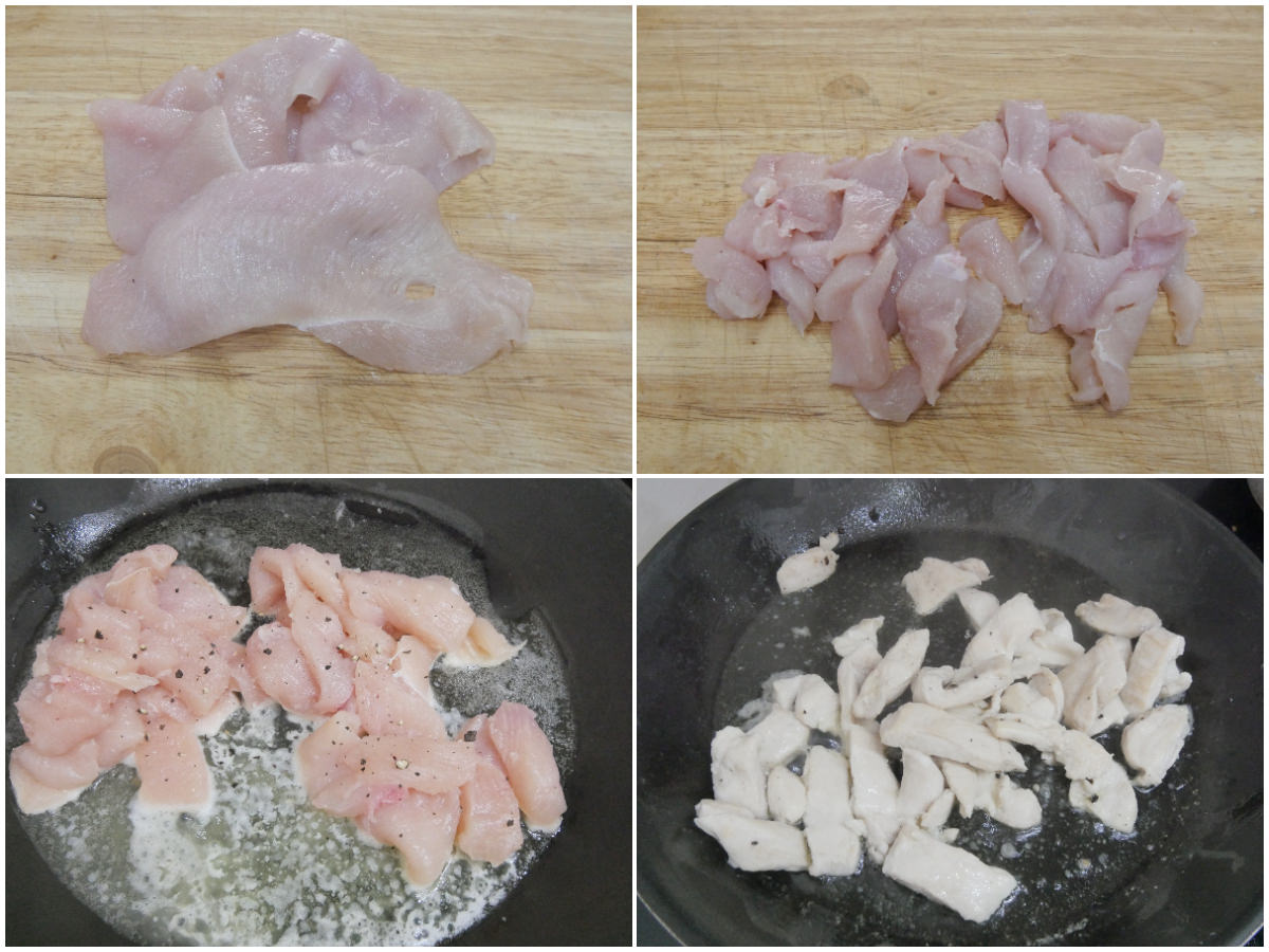 Innanzitutto tagliate il pollo a straccetti e cuocetelo con sale, pepe e metà del burro in una padella antiaderente, facendolo rosolare per bene.