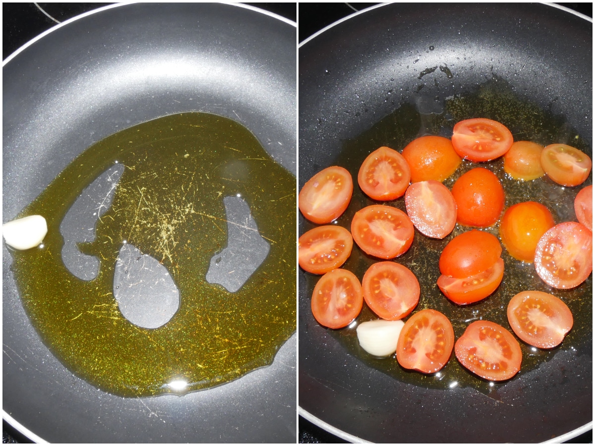 Innanzitutto fate scaldare aglio e olio in una padella, quindi aggiungete i pomodorini lavati e tagliati a metà (e, volendo, il peperoncino) e lasciate insaporire.