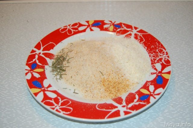 Preparare la panatura mescolando in un piatto il pangrattato, il parmigiano, l'aglio liofilizzato, il sale e il rosmarino tritato.