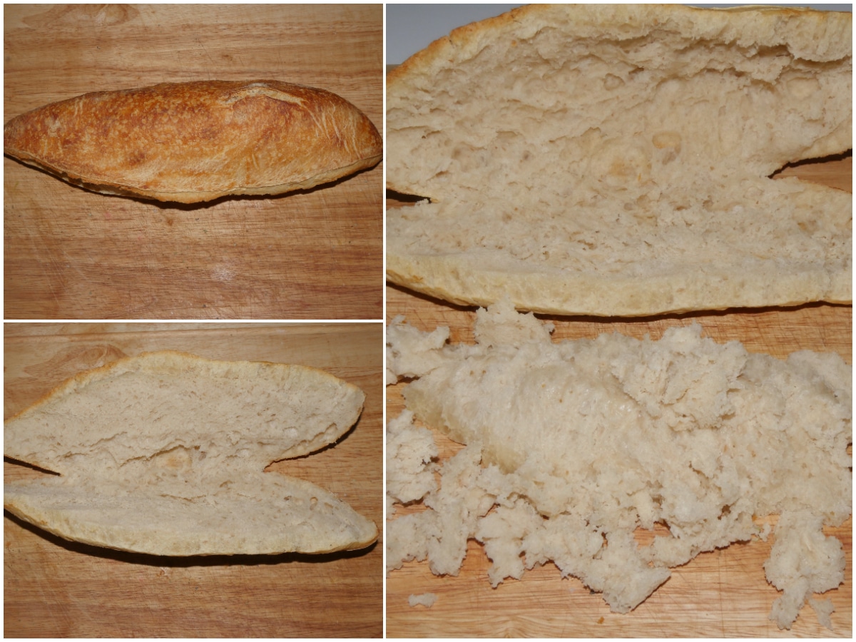 Tagliate lo sfilatino a metà per il lungo (in senso orizzontale) e svuotatelo della mollica (potete sfruttarla per altre ricette, come le polpette, o per fare del pangrattato).