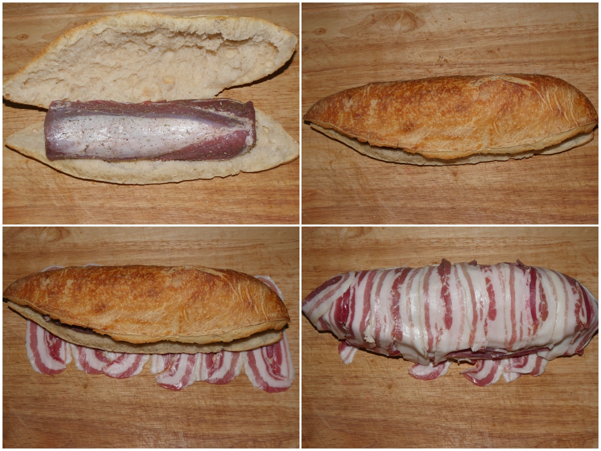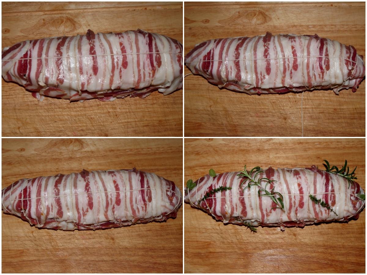 Mettete il filetto dentro al pane, richiudete e avvolgete con pancetta, procedete con la legatura come per un arrosto (qui la guida per farlo al meglio) e aggiungete gli aromi.
