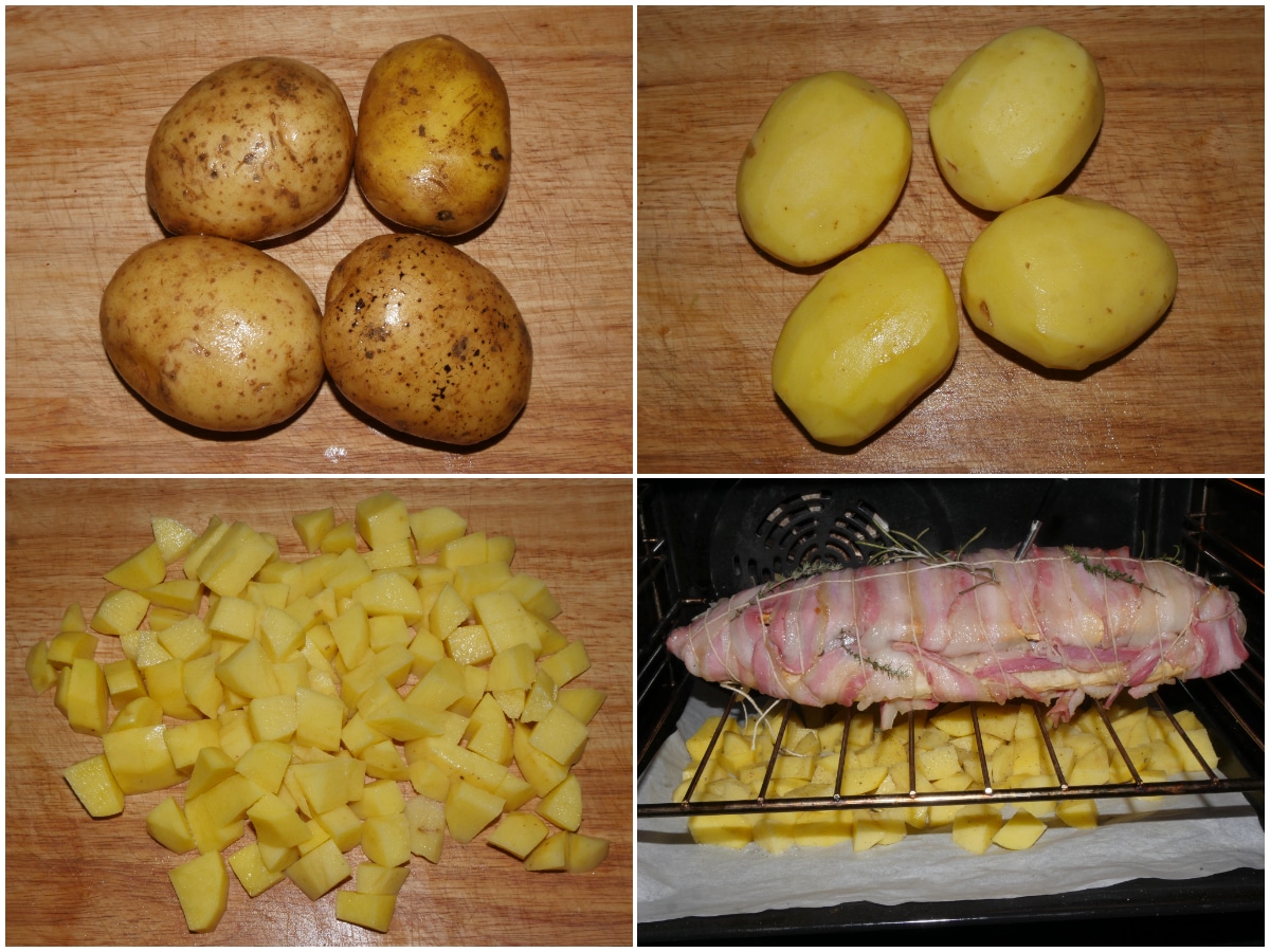 Coprite il filetto con carta di alluminio e cuocete a 200°C in forno ventilato già caldo, per circa 1 ora (se avete un termometro per carne considerate che la temperatura interna deve arrivare a circa 65-70°C), mescolando ogni tanto le patate.