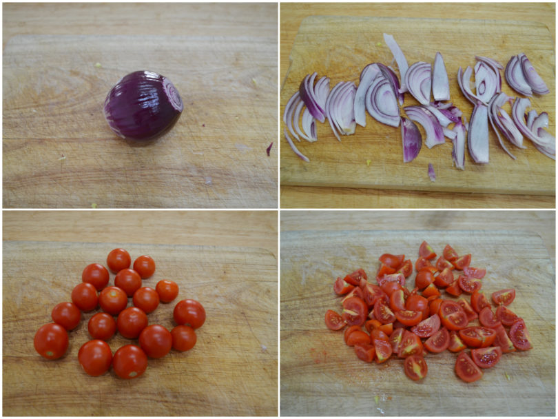 Pulite le cipolle e tagliatele a fette, quindi lavate i pomodorini e tagliateli in 2 o 4 parti, a seconda delle dimensioni.
