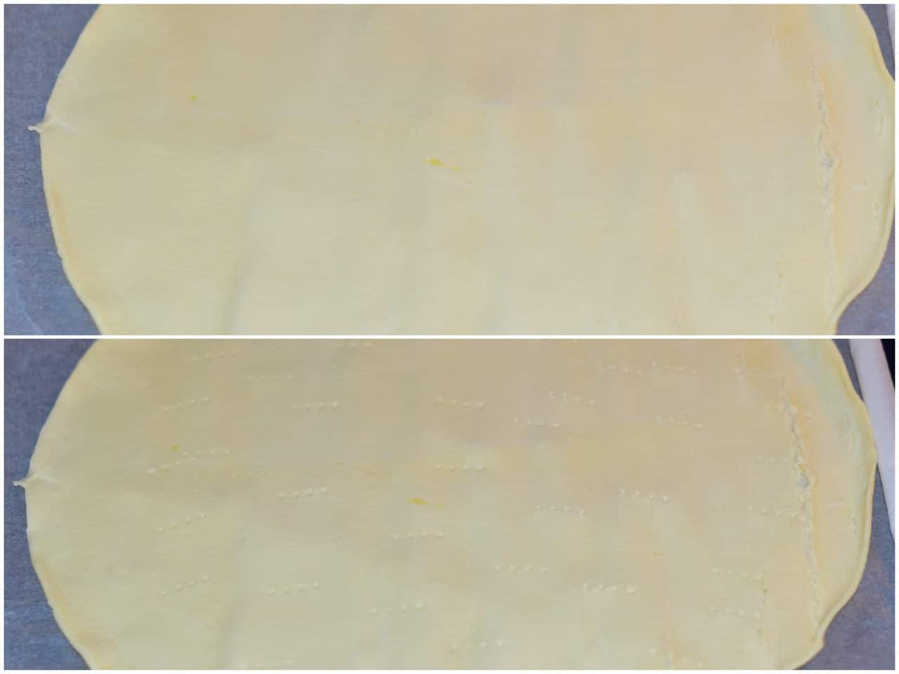 Srotolate la pasta sfoglia, bucherellatela con i rebbi di una forchetta
