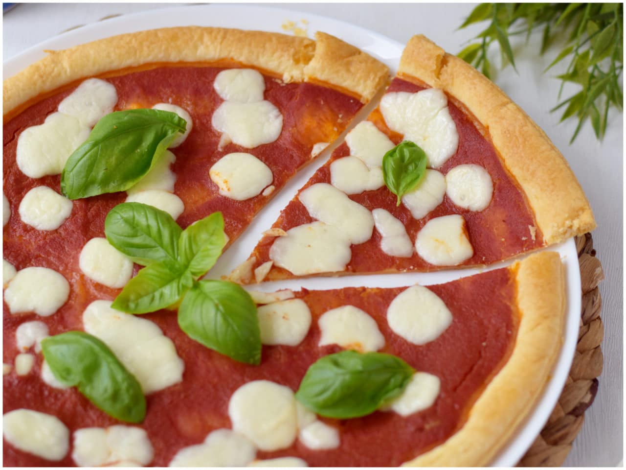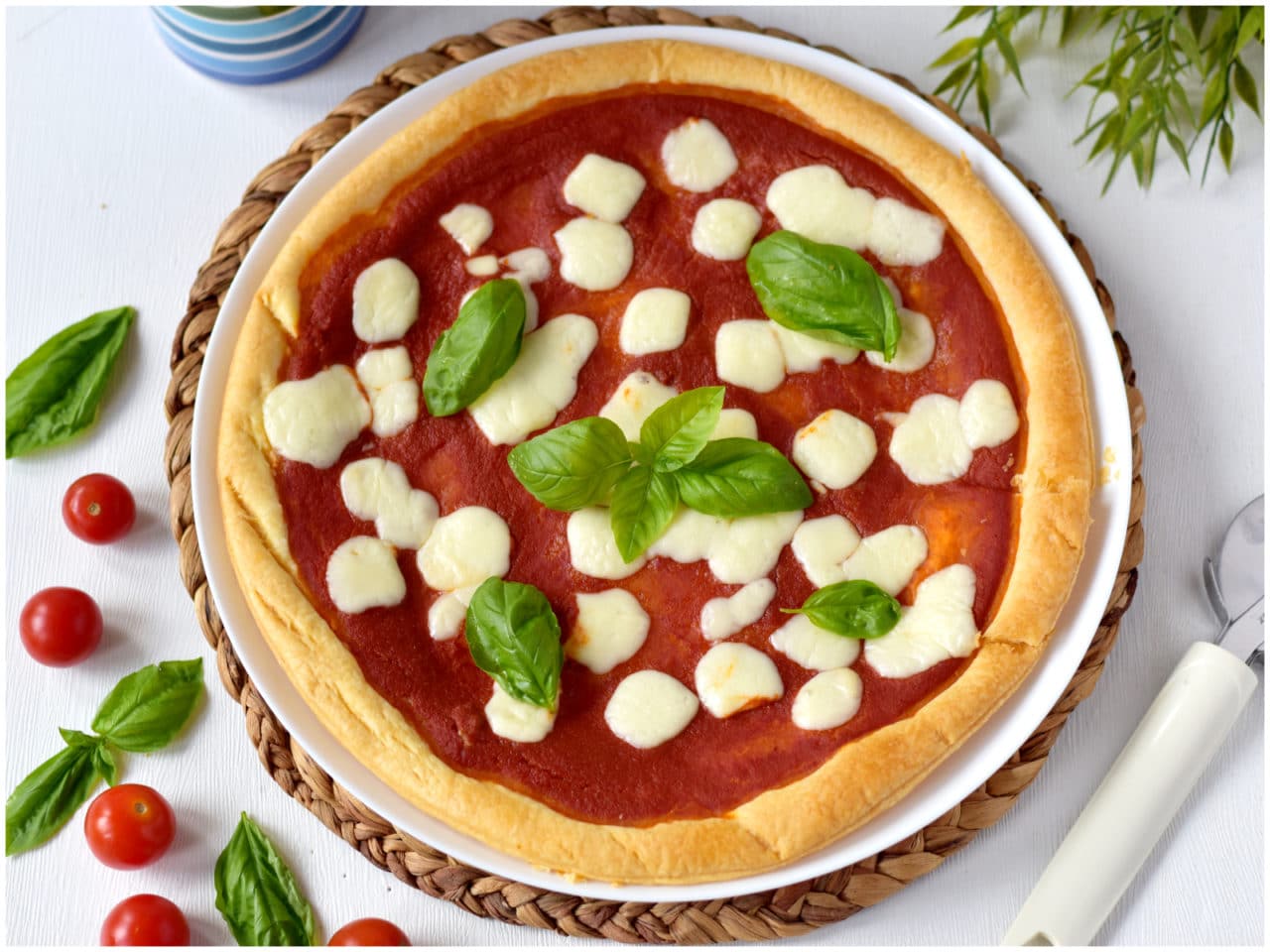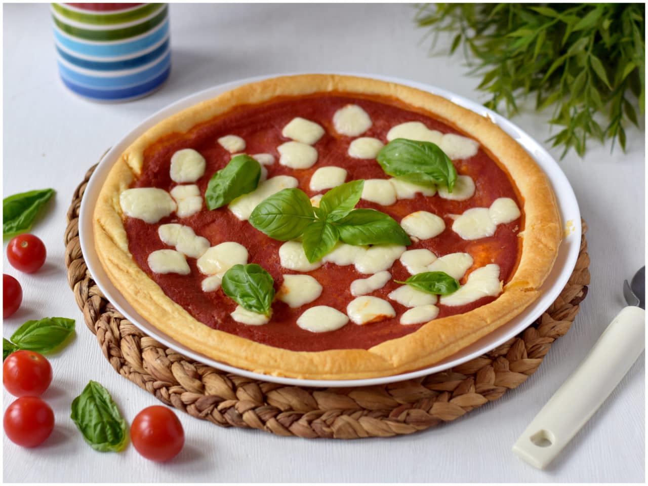 Ecco fatto, la finta pizza di pasta sfoglia è pronta, guarnitela con basilico fresco e servitela.