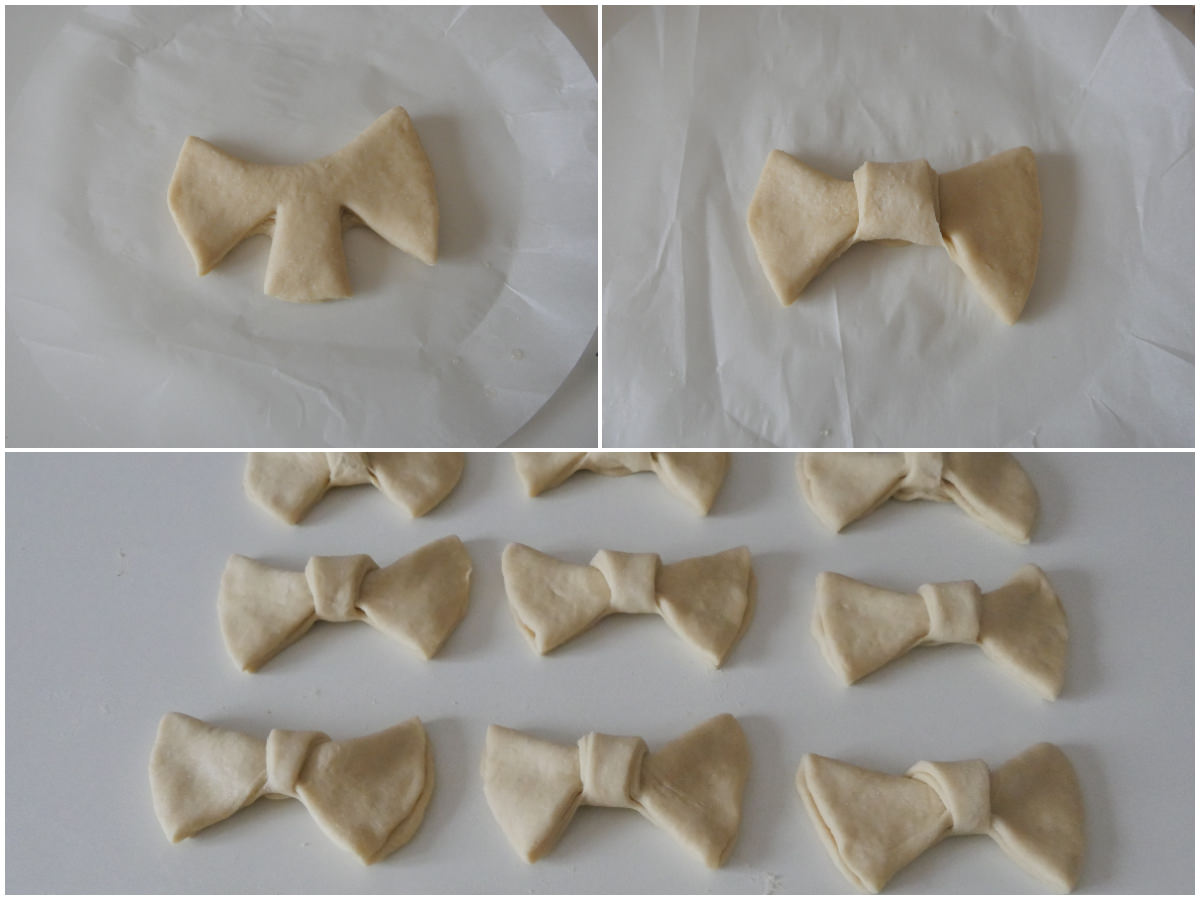 Tirate gli angoli esterni un po' verso l'alto, quindi riportate la parte centrale sopra l'impasto, per creare il fiocco.