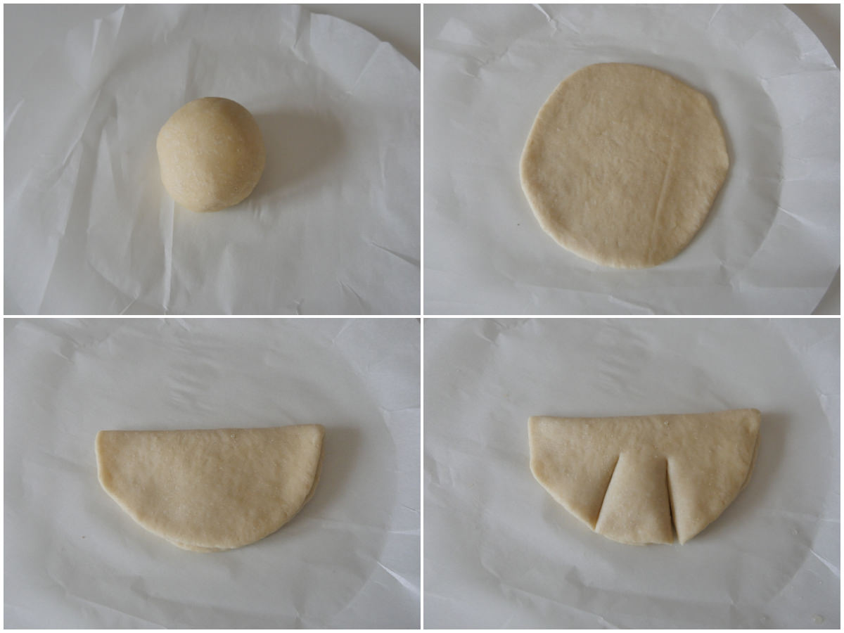 Riprendete le palline e, una per volta, stendetele, piegate a mezzaluna, quindi effettuate 2 tagli sulla parte tondeggiante, come in foto.