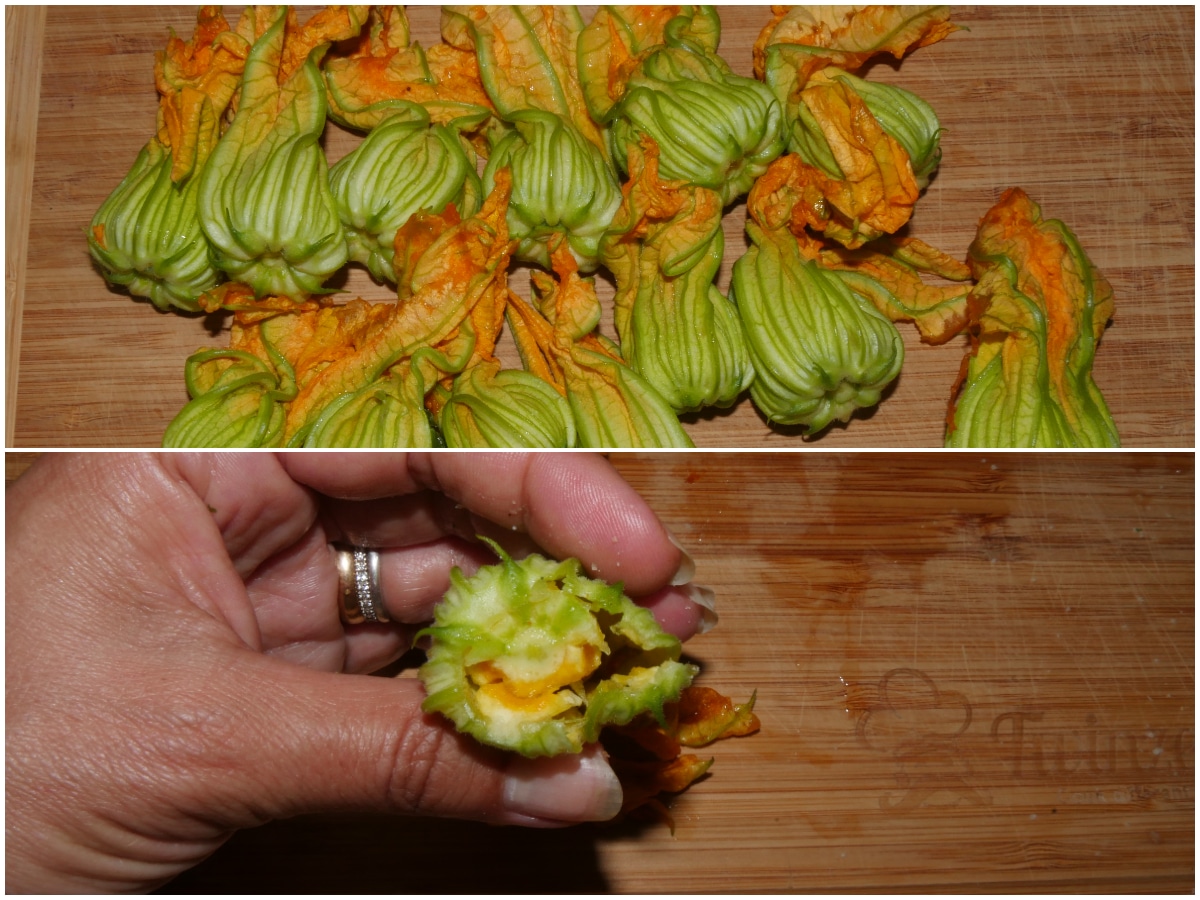 Pulite i fiori di zucca, lavandoli delicatamente ed eliminando steli e pistilli.