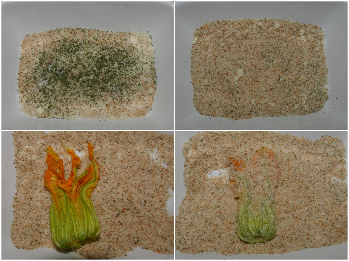 Preparate la panatura, unendo in un piatto pangrattato, parmigiano, sale, pepe e aromi tritati, e passateci i fiori, uno per volta.