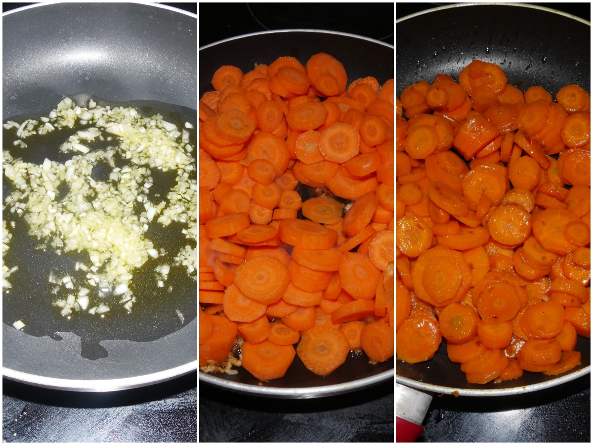 Fate appassire il cipollotto in un'ampia padella antiaderente con un po' di olio, quindi aggiungete anche le carote, condite con sale e pepe e fate rosolare per circa 10 minuti, mescolando ogni tanto.