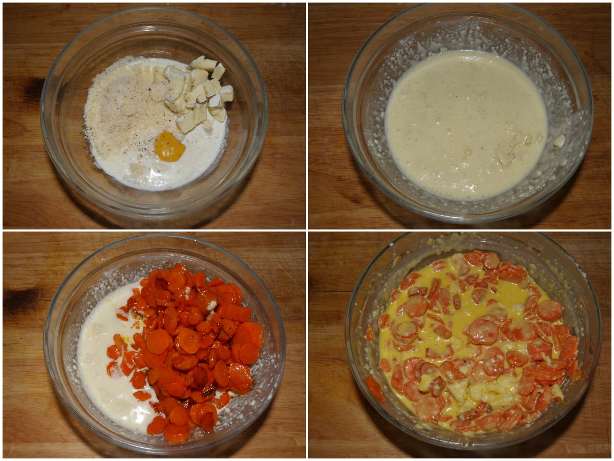 Nel frattempo, unite in una ciotola i formaggi, le uova e la panna poi unite le carote e mescolate.
