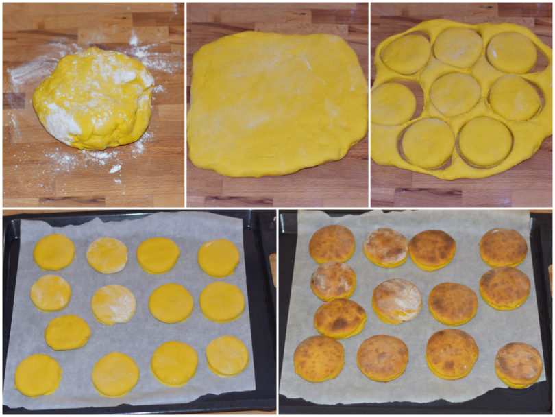 Stendete con il matterello sul piano di lavoro infarinato per ottenere una sfoglia di circa 2 cm di spessore, quindi ricavate le focaccine con un coppapasta da 5-6 cm di diametro.