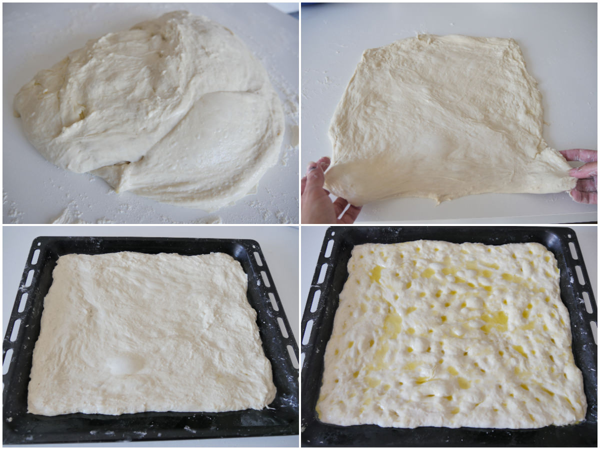 Dopo il riposo a temperatura ambiente, iniziate ad allargare e tirare delicatamente l'impasto con le dita, creandovi piano piano un rettangolo all'incirca della stessa misura della teglia che userete per la cottura.