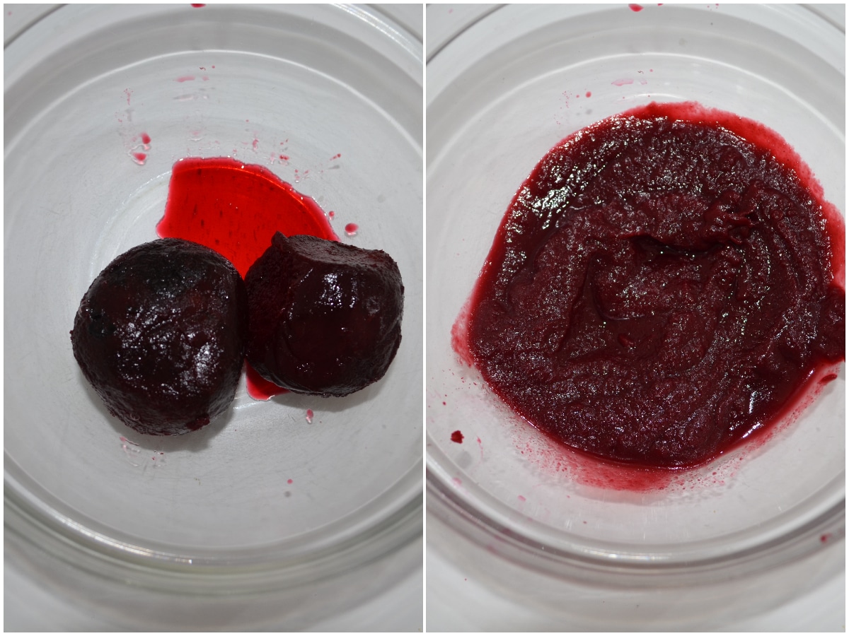Innanzitutto scolate le barbabietole, tagliatele a pezzi e frullatele finemente.