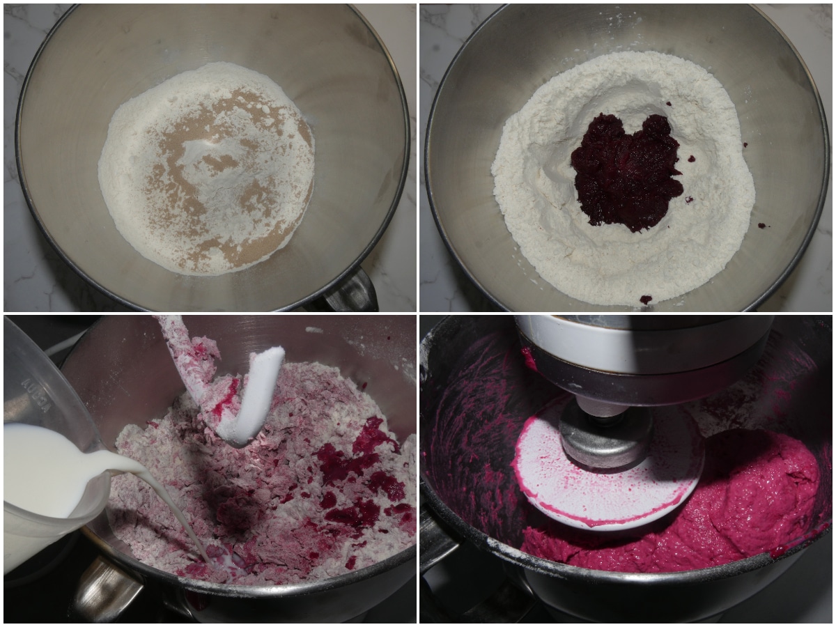 Unite in una ciotola farina, lievito, zucchero e miele e mescolate, quindi fate un buco al centro e unite prima la barbabietola e poi il latte.