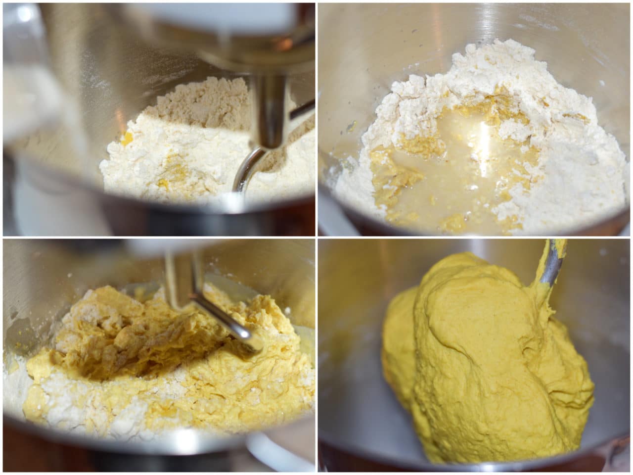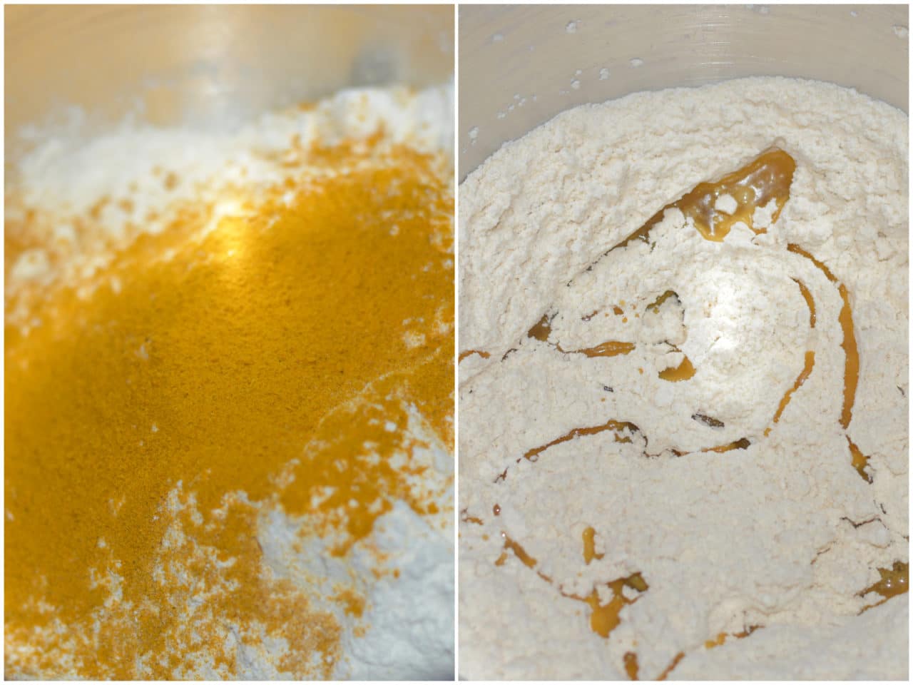 Innanzitutto mettete in una ciotola farina, curcuma e olio (i 100 ml) e mescolate.