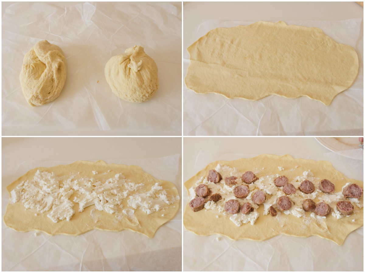 Riprendete l'impasto, dividetelo a metà e stendete entrambe le parti in sfoglie sottili, che condirete al centro con ricotta e salsicce.