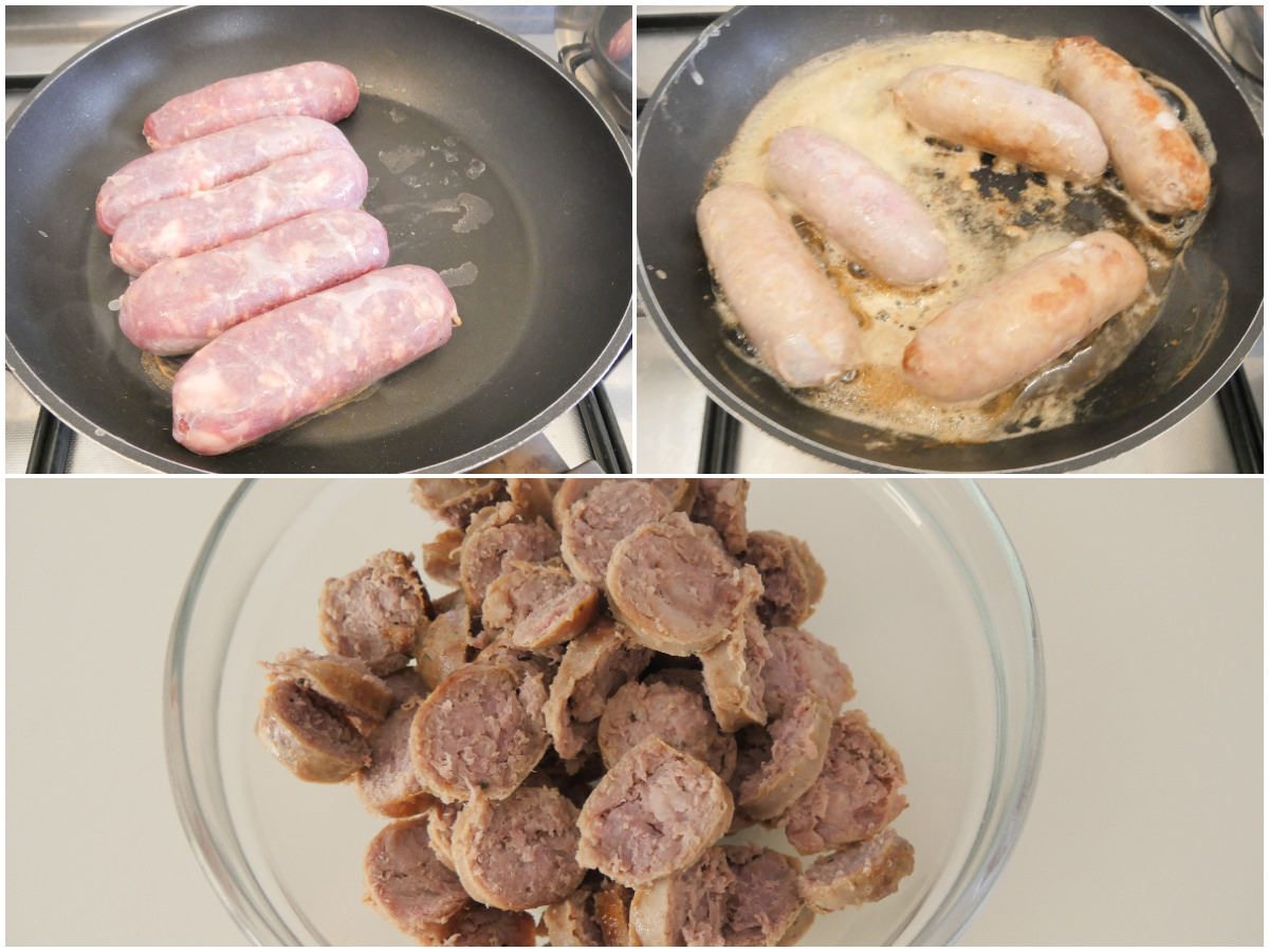 Cuocete le salsicce in una padella antiaderente con coperchio.