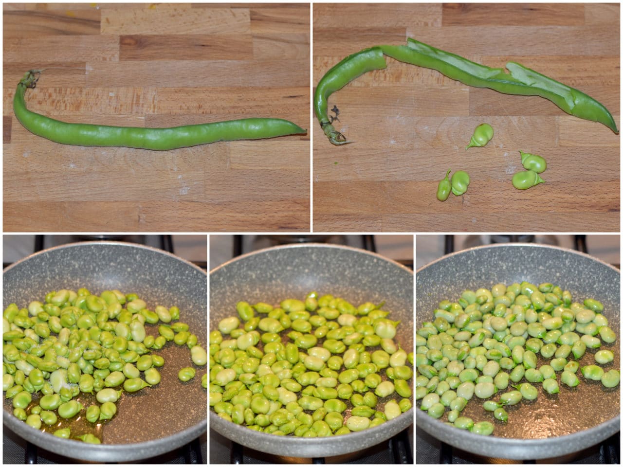Nel frattempo mondate le fave eliminando il baccello e cuocetele per pochi minuti in padella con olio, quindi salatele leggermente.