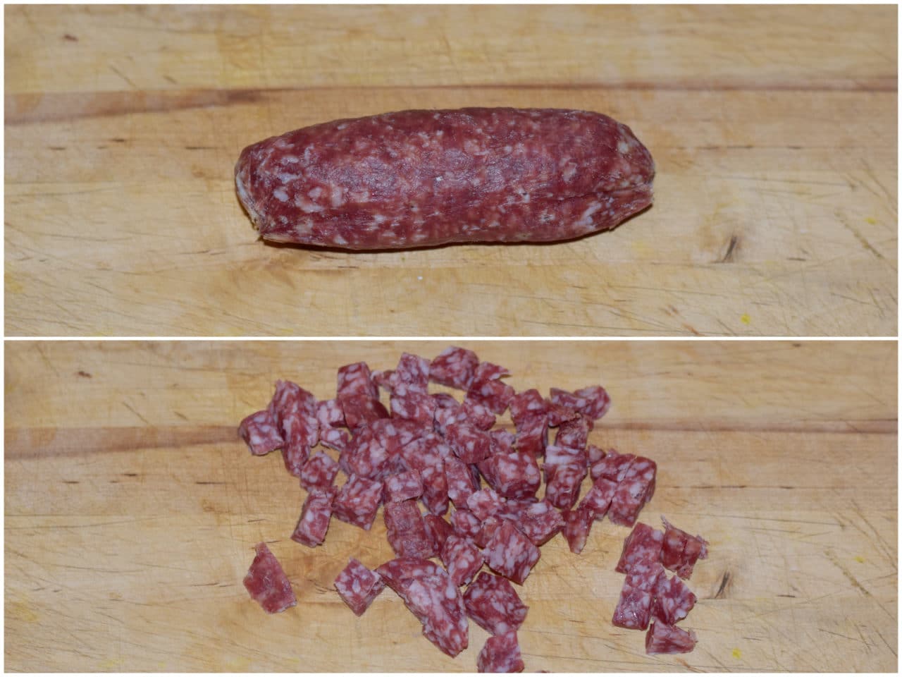 Spellate il salame mondandolo dal budello e tagliatelo a cubetti.