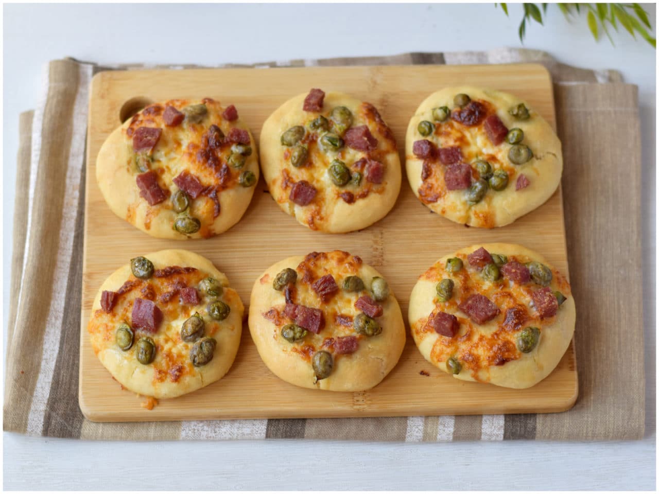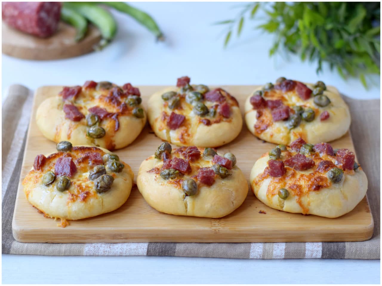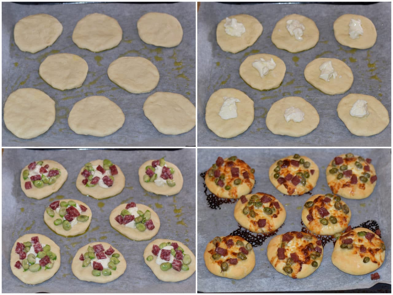 Disponetele sulla teglia rivestita di carta forno e leggermente unta di olio, conditele con formaggio, salame e fave e cuocete per circa 20-25 minuti a 180°C, in forno ventilato già caldo.