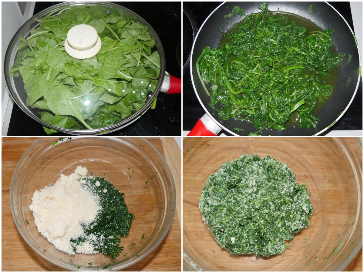 Nel frattempo preparate il ripieno: mondate e lavate le verdure, trasferitele (ancora grondanti d'acqua) in una casseruola, coprite con coperchio e fatele appassire, quindi scolatele, strizzatele delicatamente, tritatele grossolanamente e conditele con grana e un pizzico di sale.