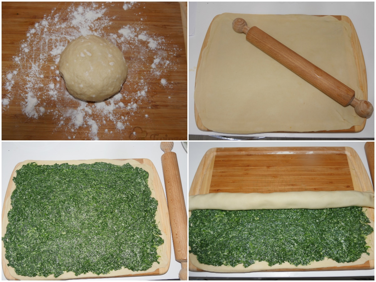 Riprendete l'impasto e stendetelo in una sfoglia molto sottile, quindi coprite la sfoglia con la farcitura e arrotolatela sul ripieno.