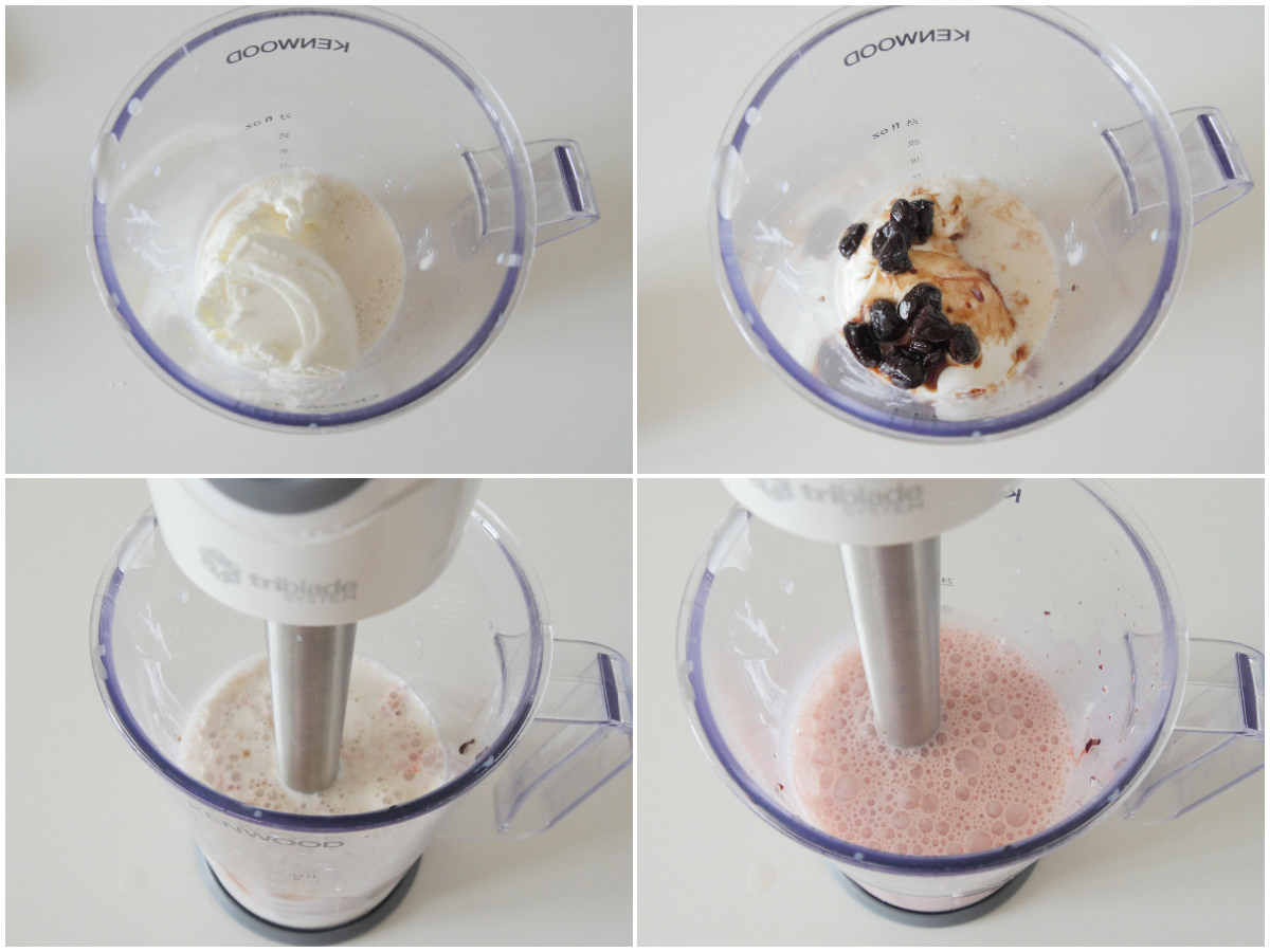 Mettete in un mixer (potete usare anche un minipimer, come ho fatto io) latte, gelato, amarene e sciroppo, tutti molto freddi (potete metterli in freezer 10 minuti prima di iniziare), e frullate velocemente fino ad ottenere un composto omogeneo.