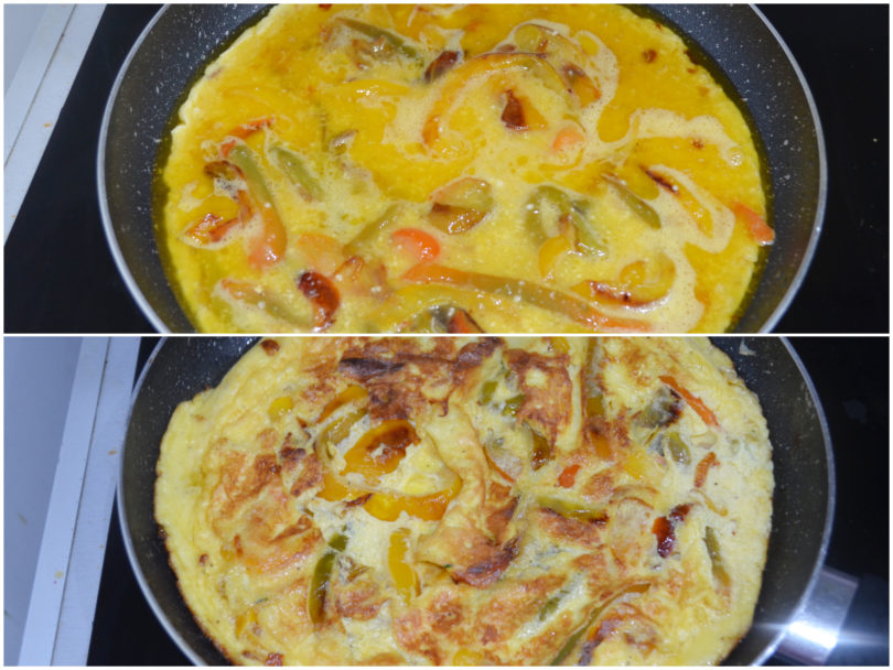 Versate in una padella un po' dell'olio di cottura dei peperoni, unite il composto di uova, coprite con un coperchio e fate cuocete a fuoco medio-basso per 5-6 minuti o fin quando le uova non si saranno rapprese.