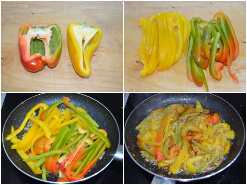 Innanzitutto lavate i peperoni e puliteli, quindi tagliateli a striscioline.