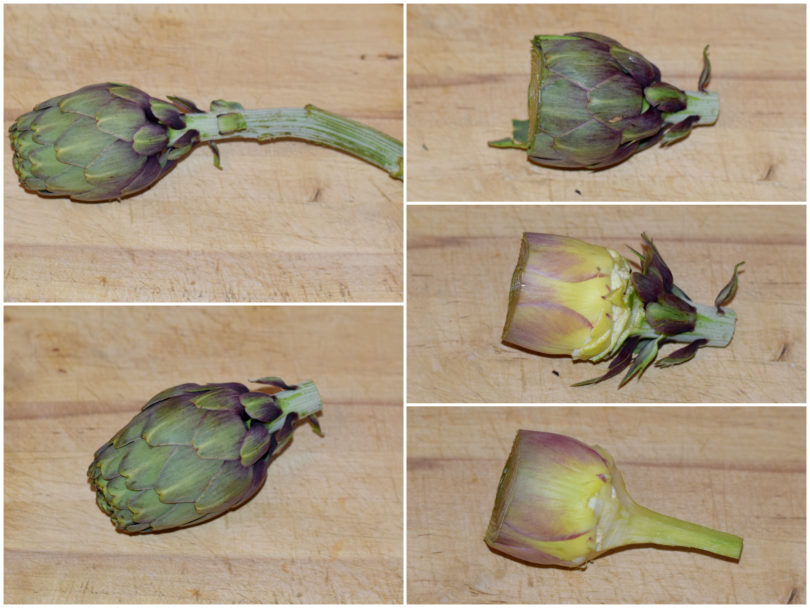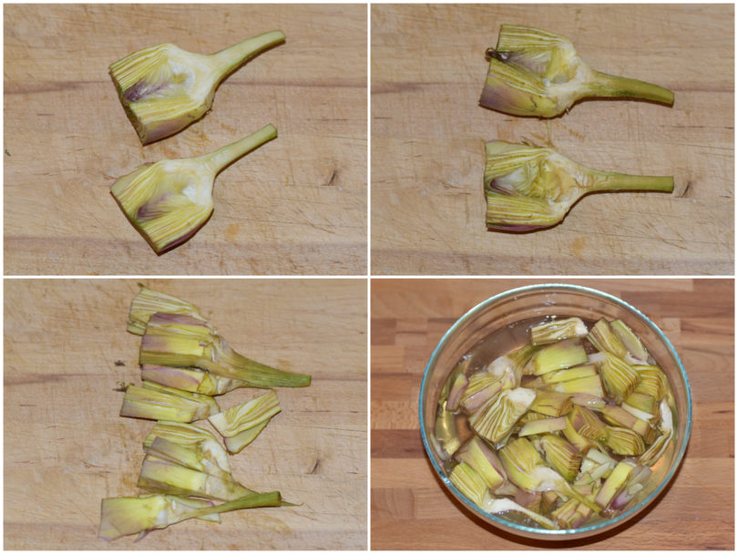Innanzitutto mondate i carciofi (qui la guida per farlo al meglio), quindi tagliateli a fettine e metteteli a bagno in acqua fredda e limone per evitare che anneriscano.