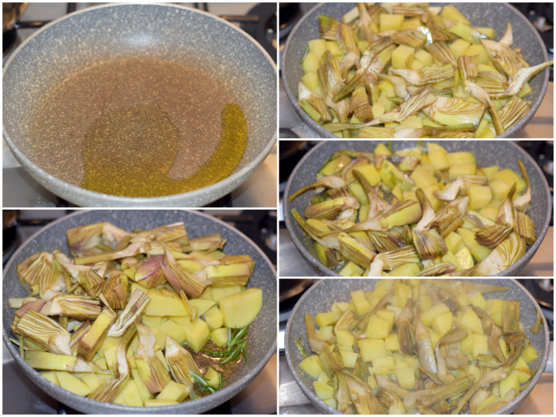 Fate scaldare un po' di olio in una padella, unite i carciofi scolati e le patate, il rosmarino e il sale e lasciate insaporire per qualche minuto, poi unite 1 mestolo di acqua calda e continuate la cottura per circa 15 minuti: sia patate che carciofi dovranno risultare teneri senza iniziare a sfaldarsi, poi lasciate intiepidire leggermente.