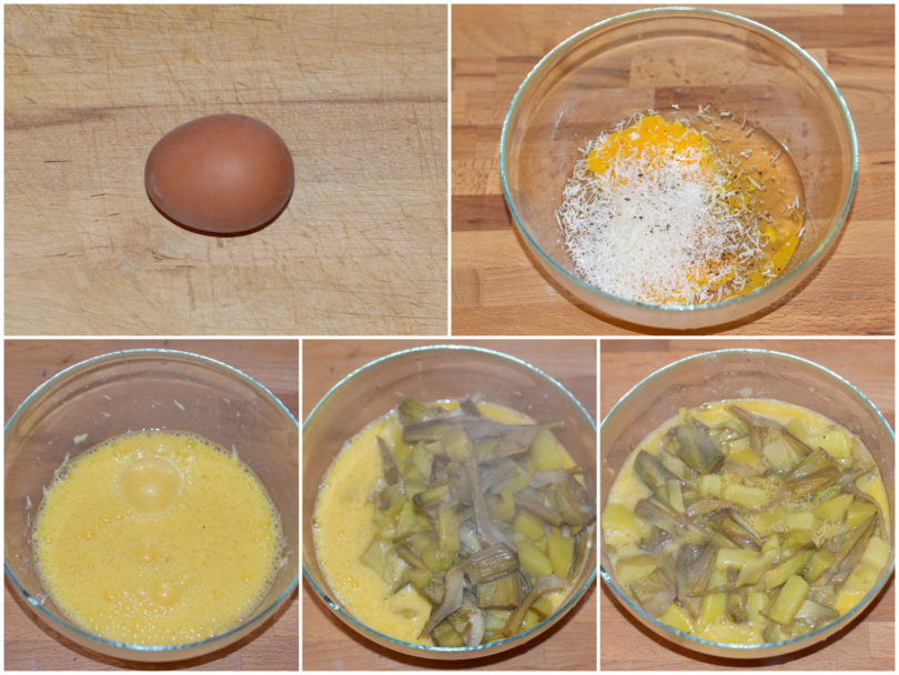 Sbattete le uova con sale, pepe e formaggio, poi unite patate e carciofi dopo aver eliminato il rosmarino.