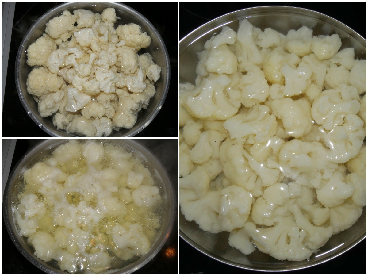 Mondate il cavolfiore, dividetelo in cimette e sbollentatelo per 5-10 minuti (dipende da quanto lo volete morbido dentro la frittata) in acqua bollente leggermente salata, infine scolatelo e lasciatelo raffreddare in una ciotola con acqua fredda e ghiaccio, per bloccare la cottura.