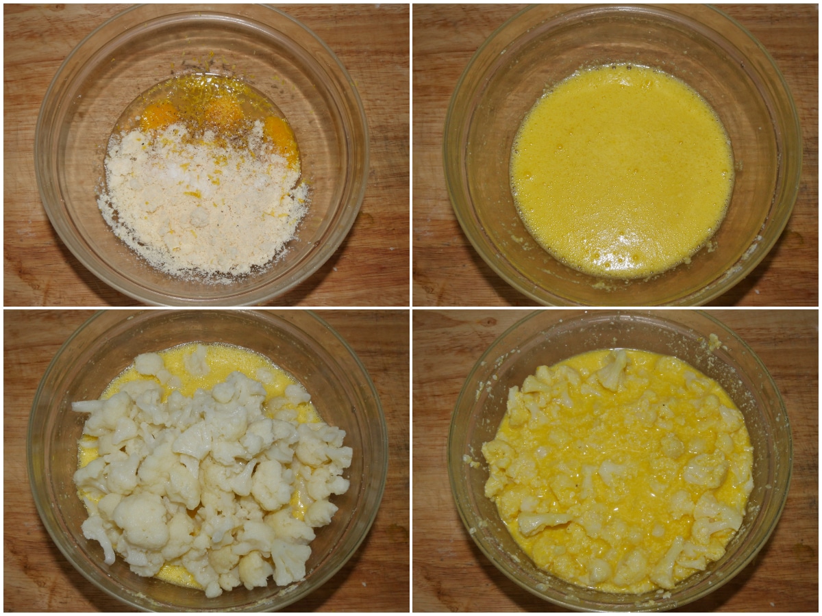 A parte, sbattete le uova con sale, pepe, buccia di limone e formaggio, quindi aggiungete il cavolfiore e mescolate delicatamente.