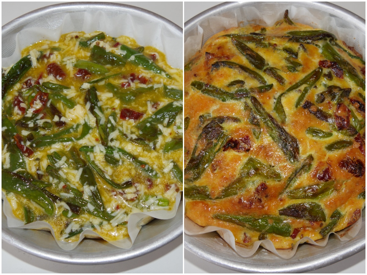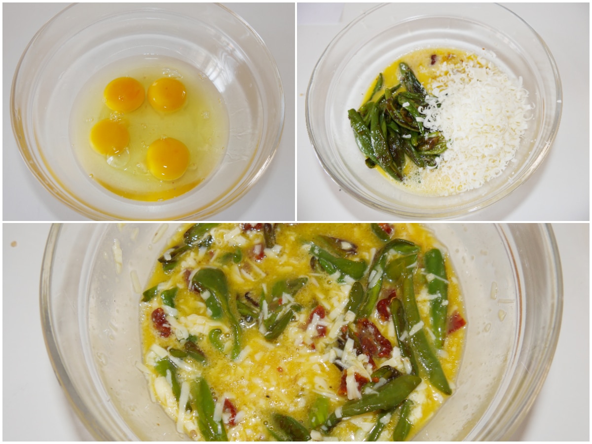 Lasciate intiepidire leggermente i friggitelli e nel frattempo sbattete le uova con poco sale e pepe, grattugiate il provolone con una grattugia a fori larghi e tagliate a pezzetti i pomodori secchi.
